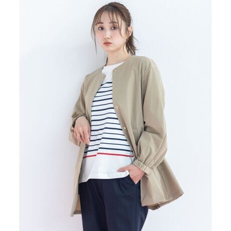 すっきりとしたノーカラーデザインが上品な印象のハーフコート。
