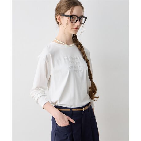 [型番:291195]さりげない同色刺しゅうがポイントフロントに施された英字ロゴ刺しゅうがアクセントになるロングTシャツ。さらりとした肌触りの良い生地を使用し、快適な着心地を演出します。丸みのあるクルーネックのデザインが魅力的。1枚で着用したり、ジャケットのインナーとしても活躍するアイテムです。