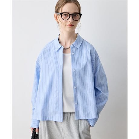 [型番:293250]ショート丈でトレンドライクな着こなしにストライプ柄のデザインが爽やかな印象を与えるシャツ。短めのショート丈になっているので、ウエストラインを高く見せる効果が得られます。裾は前後差があるため、タックアウトしたスタイリングもおすすめ。季節の変わり目のお出かけスタイルに大活躍するアイテムです。
