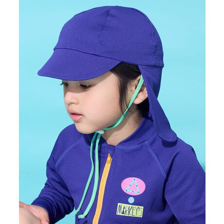 ツバ付きデザインに首まわりまでカバーする日よけ布を組み合わせた、実用性の高いスイムキャップです。