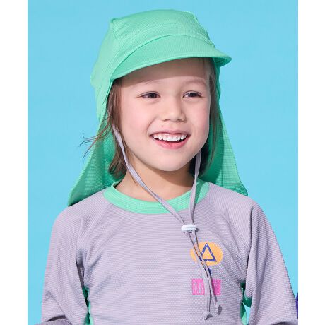 あご紐付きなので脱げにくく、水遊びやレジャーシーンにも使いやすい仕上がりです。