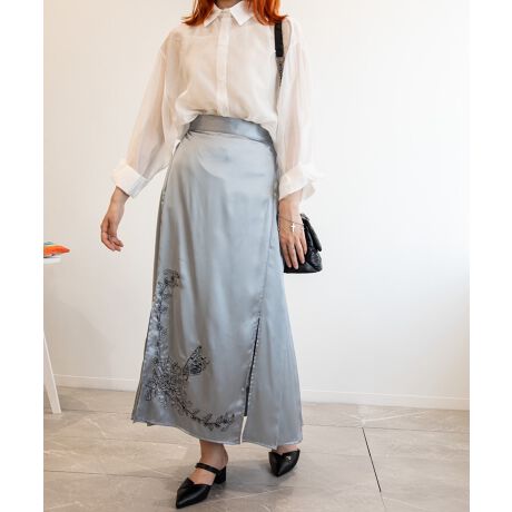 落ち優たれ、履き心地のサテンスカート。 フロント裾にオリジナル手描き花に乗せた蝶々刺繍あり、サイトにスリット入り、歩くたびにサイドのスリットが軽やかになびき、動きのあるコーディネートになります。 バックにプリーツ、雰囲気転回して可愛いです。 程よいゆったり感のあるシルエットで、トレンドライクな着こなしが叶うItem。 ウエストはゴム仕様だから楽ちんな履き心地です。