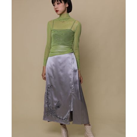 落ち優たれ、履き心地のサテンスカート。 フロント裾にオリジナル手描き花に乗せた蝶々刺繍あり、サイトにスリット入り、歩くたびにサイドのスリットが軽やかになびき、動きのあるコーディネートになります。 バックにプリーツ、雰囲気転回して可愛いです。 程よいゆったり感のあるシルエットで、トレンドライクな着こなしが叶うItem。 ウエストはゴム仕様だから楽ちんな履き心地です。