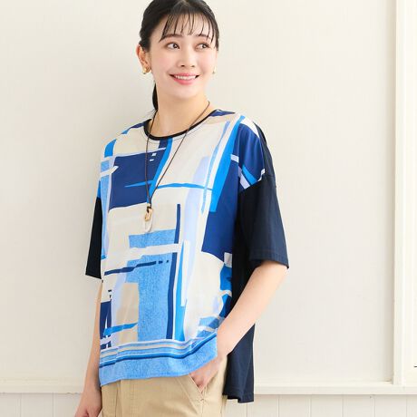 袖や後ろは肌心地の良い天竺素材を採用。柄と無地のコントラストが効いた人気のデザインです。