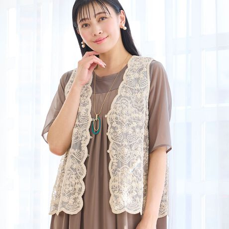 上品な透け感と刺繍の華やかさが魅力のベストをせひ。