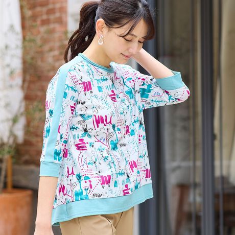 襟ぐりや裾を無地で切り替えることでメリハリが生まれ、すっきりとした印象でお楽しみいただけます。