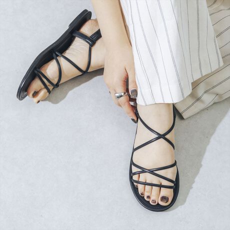 華奢なナローストラップがすっきりとした足元を演出してくれるフラットサンダル!美脚見えするよう計算されたストラップ配置で、抜け感と女性らしさを兼ね備えたデザインに仕上げました。フラットソールで歩きやすく、長時間履いても疲れにくいよう足裏に優しいクッション入り!ゴム仕様のバックベルトでサッと着脱が出来るので、お子様のいるママさんにもおすすめです。シンプルだからこそどんなコーディネートにも合わせやすく、ワードローブに1足持っておくと重宝するアイテム!デイリー使いはもちろん、驚きの軽さなので旅行先への持ち運びにもぴったりです◎