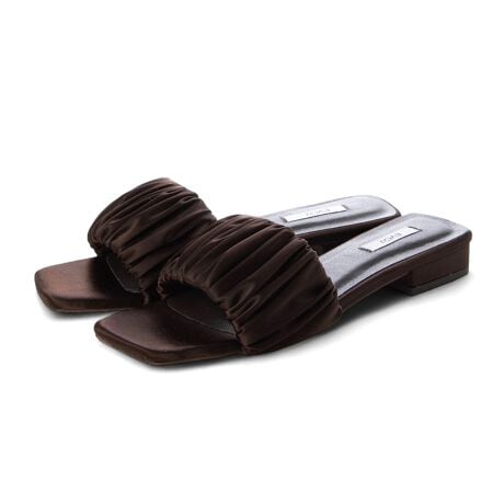たっぷりのギャザーとトレンドのスクエアトゥが絶妙なバランスのミュールサンダル!太すぎないアッパーとはっきりとしたスクエアトゥが、足元にメリハリを出しすっきりと見せてくれます。ぷっくりとした厚みのある中敷き入りで、足裏に心地良くフィットしてくれるのも嬉しいポイント。上品なツヤ感と高級感のあるサテン素材が、ミュールタイプでもカジュアルに見え過ぎず、高見えすること間違いなし◎シンプルなスタイリングや、デニム合わせでカジュアルダウンするのも可愛くておすすめです!