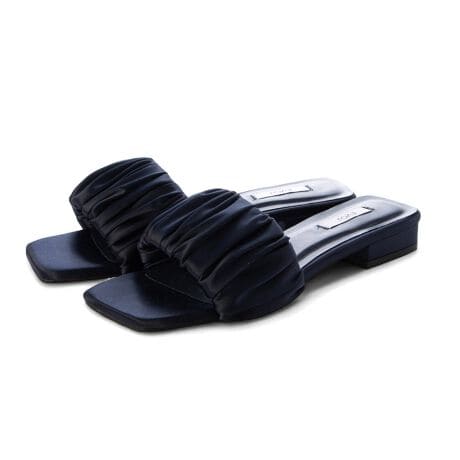 たっぷりのギャザーとトレンドのスクエアトゥが絶妙なバランスのミュールサンダル!太すぎないアッパーとはっきりとしたスクエアトゥが、足元にメリハリを出しすっきりと見せてくれます。ぷっくりとした厚みのある中敷き入りで、足裏に心地良くフィットしてくれるのも嬉しいポイント。上品なツヤ感と高級感のあるサテン素材が、ミュールタイプでもカジュアルに見え過ぎず、高見えすること間違いなし◎シンプルなスタイリングや、デニム合わせでカジュアルダウンするのも可愛くておすすめです!