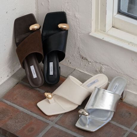 毎年大人気のトングサンダルがアップデートして新登場!ぷっくりと立体感のあるメタルパーツをプラスし、トレンド感たっぷりのデザインに仕上げました。はっきりとしたスクエアトゥと斜めにカットされたアッパーがシンプル過ぎず程よいアクセントに◎トング部分にも柔らかい素材を使用しているので、痛くなりにくく快適な履き心地です。高過ぎない太ヒールは、安定感があり美脚効果があるのも嬉しいポイントです。メタルパーツのアイテムは、この夏1足は持っておきたいマストアイテム!