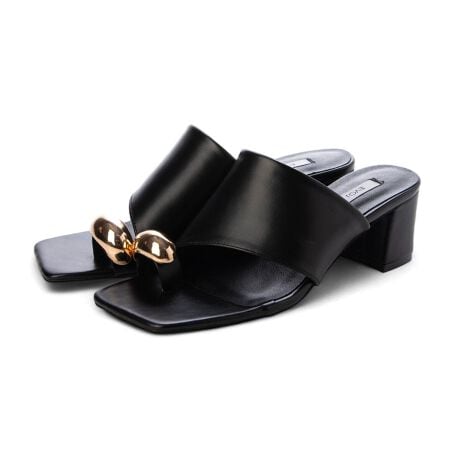 毎年大人気のトングサンダルがアップデートして新登場!ぷっくりと立体感のあるメタルパーツをプラスし、トレンド感たっぷりのデザインに仕上げました。はっきりとしたスクエアトゥと斜めにカットされたアッパーがシンプル過ぎず程よいアクセントに◎トング部分にも柔らかい素材を使用しているので、痛くなりにくく快適な履き心地です。高過ぎない太ヒールは、安定感があり美脚効果があるのも嬉しいポイントです。メタルパーツのアイテムは、この夏1足は持っておきたいマストアイテム!