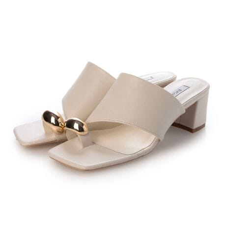 毎年大人気のトングサンダルがアップデートして新登場!ぷっくりと立体感のあるメタルパーツをプラスし、トレンド感たっぷりのデザインに仕上げました。はっきりとしたスクエアトゥと斜めにカットされたアッパーがシンプル過ぎず程よいアクセントに◎トング部分にも柔らかい素材を使用しているので、痛くなりにくく快適な履き心地です。高過ぎない太ヒールは、安定感があり美脚効果があるのも嬉しいポイントです。メタルパーツのアイテムは、この夏1足は持っておきたいマストアイテム!