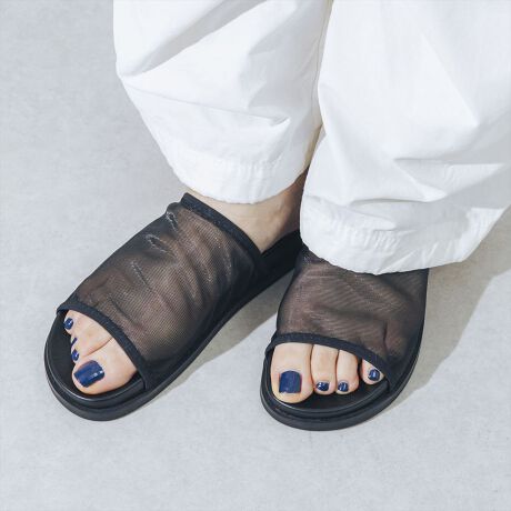 絶妙なシアー感のメッシュチュールが大人な雰囲気を演出してくれるフラットサンダル!手でクシュクシュ出来るほど柔らかい素材と、甲深のワンベルトデザインで、足に優しくホールド感抜群の履き心地です。軽量ソールで長時間の着用も疲れにくく、普段使いにはもちろんお出かけにもぴったり◎サッと履けるミュールタイプは着脱に手間がかからず、お子様のいるママさんにもおすすめです。カジュアルなコーディネートはもちろん、ワンピースやスカートにもハマる万能アイテム!