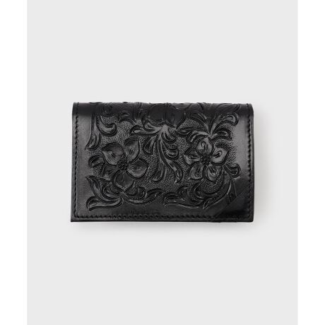 正面のフラップの角に三角の小さなポケットが付いており、頂いた名刺を入れて机に置いて置ける仕様。中は中心が仕切られているので分けて収納もできます。