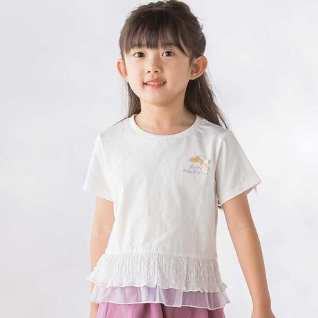 異素材フリルがふんわり揺れる、リボン×刺しゅうが可愛い女の子用Tシャツ。