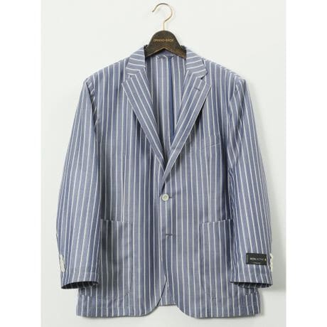 サマージャケットとして盛夏まで羽織れる軽量仕立てのテーラードジャケット(2ボタン・ノッチドラペル・左胸ポケット・2パッチポケット・サイドベンツ)です。爽やかなストライプ柄で程良いカジュアル感を表現しています。