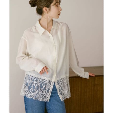 ポリエステル×アセテートのさらっとした素材を土台に、センシュアルな雰囲気を持つレースを裾に大胆にドッキングしたシャツブラウス。
