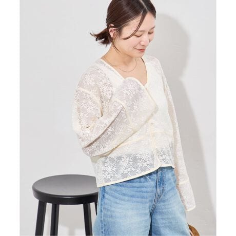 今年旬なレース素材を使用したカーディガン。ポコポコした表情のあるレース素材を使用。切り替えを入れた、カーディガンのように羽織れるブラウス。レイヤードに使いやすく、先々まで活躍します。