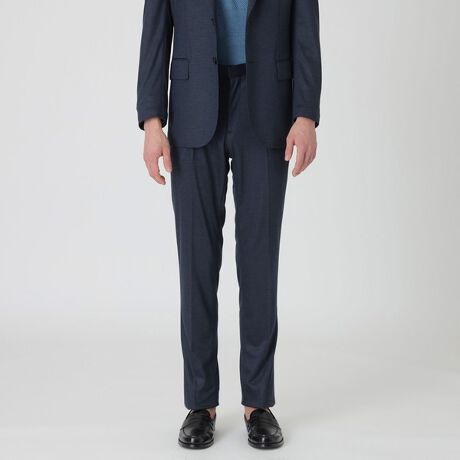 日本で最も長い歴史のあるスーツ生地メーカーである御幸毛織の別注素材を使用しています。6色のカラーをブレンドした別注トップ染め糸を使用したモクロディー素材。スムース編みをベースにした両面編みの変化組織で、編地がしっかりとしており高密度で滑らかな表面が特徴です。加工面では煎毛工程で不要な毛羽を刈り、シルキー加工で上品な光沢を付け高級感ある素材に仕上げております。また伸縮性があるため、着心地の良さも兼ね備えています。