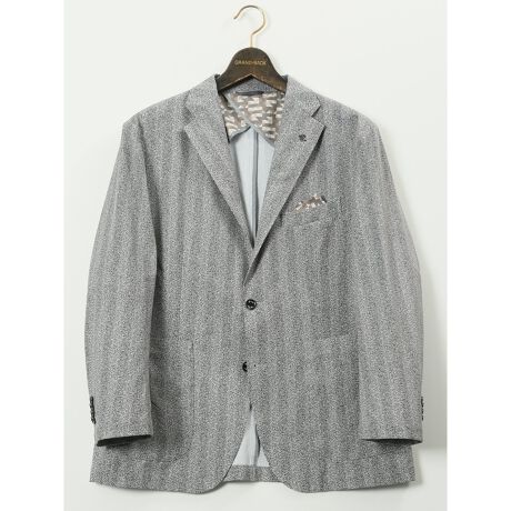 サマージャケットとして盛夏まで羽織れるテーラードジャケット(2ボタン・ノッチドラペル・2パッチポケット・左胸ポケット・サイドベンツ・チーフ付き・蜂のアイコン)です。同素材のセットアップパンツにスニーカーを合わせるとスポーティーな着こなしが完成します。プライベートからオフィスカジュアルまでオンオフ兼用で大活躍してくれます。
