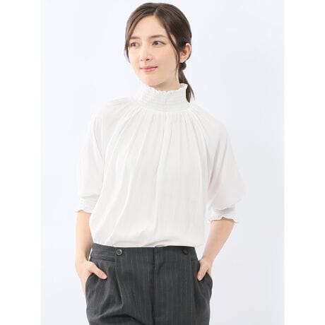 お顔まわりを華やかに演出してくれる、ハイネックのプルオーバーブラウスです。衿と袖口のフェミニンなシャーリングと、肩幅を気にせず着用できるラグランスリーブがポイント。裾部分は前はストレート、後ろはラウンドで着丈に前後差を付けています。