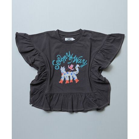 フロントには遊び心のあるロゴプリントをのせて、甘さの中にカジュアルさをプラスしました。