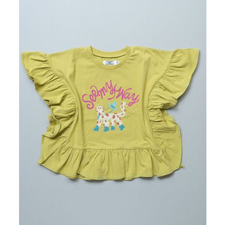 肩から裾にかけてぐるりとあしらったフリルが目を惹く、華やかなデザイントップスです。