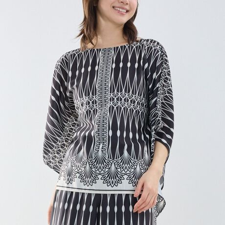 アールデコ調のモノトーンプリントが印象的な半袖スクエアブラウス。光沢感のあるポリエステル素材を使用し、洗練された雰囲気に仕上げています。裾に向かって広がる贅沢なドレープが動きのあるシルエットを生み、華やかな印象を演出。襟元は程よいボートネックで、リラックス感がありながら上品に着用できます。モノトーン配色で差し色のアイテムとも合わせやすく、幅広いスタイリングに活躍する1着です。