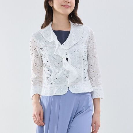 [型番:30-61-21-520]コットンのエンブロイダリーレース生地を使用した長袖ジャケット。フリルディテールを取り入れたナラカミーチェらしいデザインで、初夏の羽織りとして活躍する1着です。涼しげなレース素材は通気性が良く、やさしい肌触りも魅力。タンクトップやカットソー、シンプルなワンピースにさらりと羽織るだけで、上品で華やかなスタイリングに仕上がります。・カラー展開はホワイト・サイズ展開は1(M)9号・2(L)11号・3(2L)13号・4(3L)15号