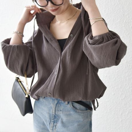 釦を閉めてブラウスとしてはもちろん、羽織りとしても着回せる一枚です。