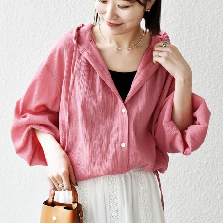 フーディーデザインが印象的な楊柳ブラウス。