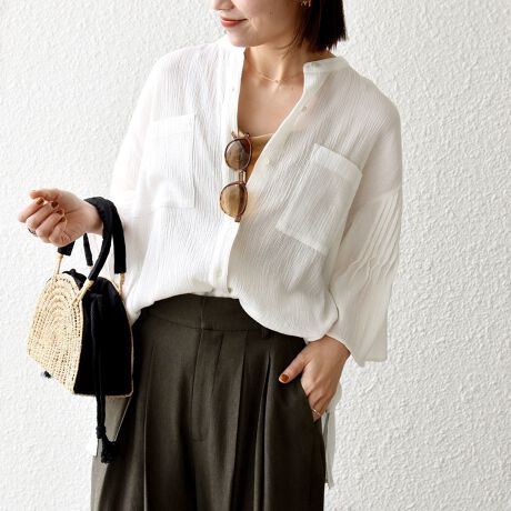 バンドカラーですっきりとした印象のシャツブラウスです。