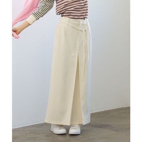 センターの深めタックが歩くたびに自然な動きを生み、ウエストはリボンで調整、後ろはゴム仕様でフィット感を確保。