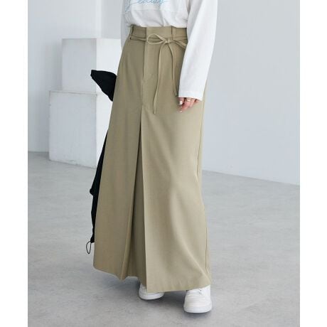 センターの深めタックが歩くたびに自然な動きを生み、ウエストはリボンで調整、後ろはゴム仕様でフィット感を確保。