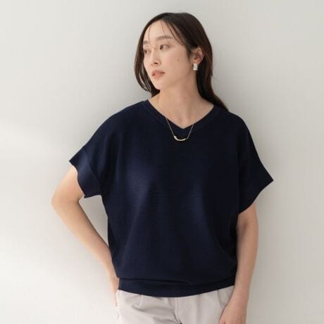 薄手で透けにくい肉感で、さらっとした清涼感のあるストレッチ素材を使用したフレンチスリーブプルオーバー。
