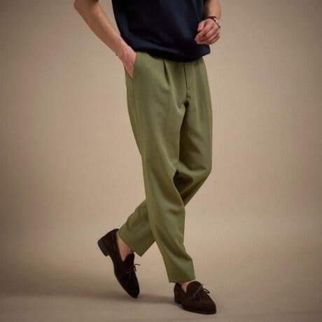 ワンタック、後ろゴムシャーリング仕様でゆとりのあるリラックスした腰回りに、程よくテーパードしたシルエットでカジュアルスタイリングを上品でクリーンな印象に演出してくれます。