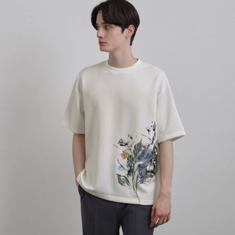 水彩画のような繊細なタッチで描かれた、アートなフラワープリントが目を惹くTシャツ。