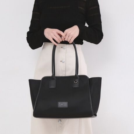 ・横に広いトートフォルムでA4資料もすっきり収まる、都会的で洗練された佇まい。