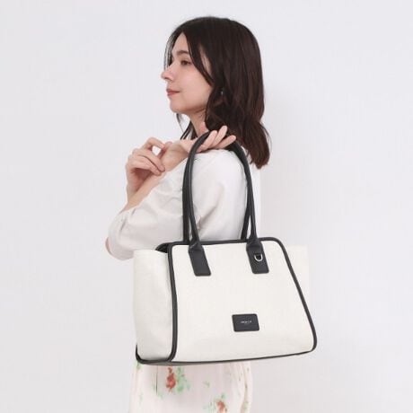 ・横に広いトートフォルムでA4資料もすっきり収まる、都会的で洗練された佇まい。