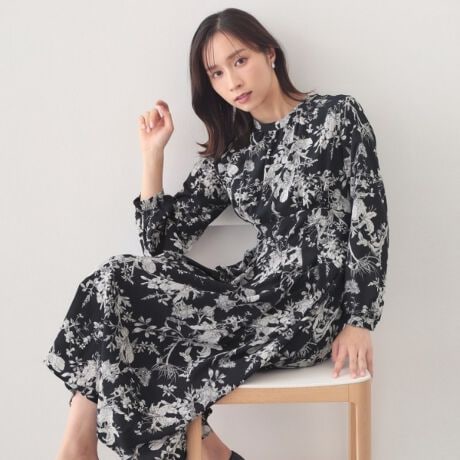 ・上品なフラワープリントが施され、華やかさとエレガンスを兼ね備えた一着。