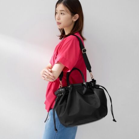 紐を絞らないと広がりのある大容量トートとして活躍し、荷物が多い日も頼もしく、紐を絞るとフォルムがコンパクトになり、ショルダーバッグとしてのバランスも◎。