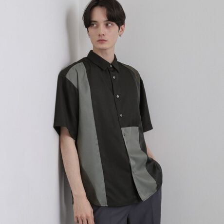 異なる色や質感の生地を、パッチワークのように大胆に切り替えた、アートな雰囲気のデザインシャツ。