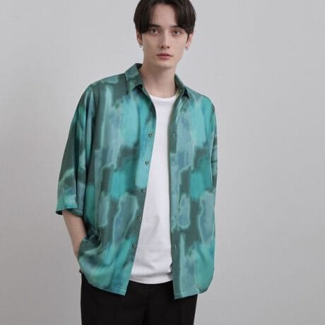 絵画のような抽象的なプリントが目を惹く、ドルマンスリーブの半袖シャツ。