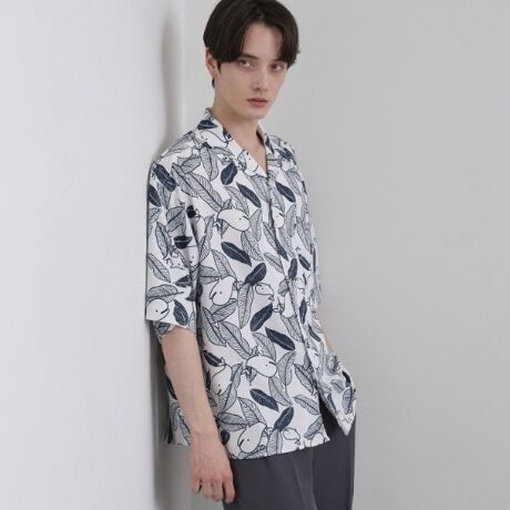 夏らしいリーフ柄の中に、サーフィンを楽しむクジラのモチーフを忍ばせた、遊び心あふれるオープンカラーシャツ。