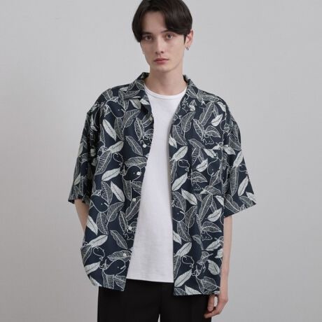 夏らしいリーフ柄の中に、サーフィンを楽しむクジラのモチーフを忍ばせた、遊び心あふれるオープンカラーシャツ。