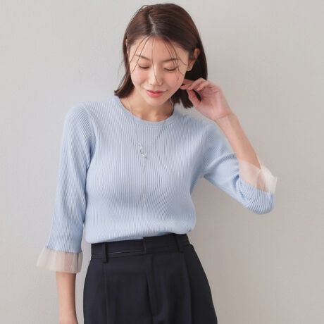 ・袖口にはシアー素材にさりげない配色を取り入れ、軽やかさと上品さを兼ね備えています。