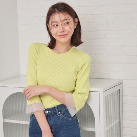 ・袖口にはシアー素材にさりげない配色を取り入れ、軽やかさと上品さを兼ね備えています。