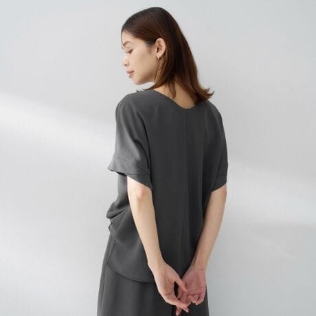 片面にはタックのアクセントが施し、もう片面はシンプルな浅めなVネックデザインでデコルテラインに抜け感を。