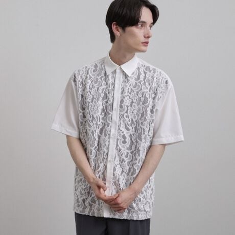 フロントに大胆にレース素材を使用した、軽やかな雰囲気の半袖シャツ。