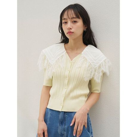 <b>【エンブロイダリーレースを施したビッグカラーがフェミニンでモードなニットカーディガン】</b>